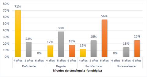 Estos resultados coinciden con los expresados por algunos autores considerando que la aparición de la conciencia fonológica tiene lugar en torno a la edad de 4-5 años, mientras que otros la sitúan en 6-7 años, Bruce, (1964; citado en Jiménez y Ortiz, 1995). Estas discrepancias obedecen a los diferentes niveles de conciencia fonológica que los autores han considerado. Así, por ejemplo, los trabajos de Liberman y colaboradores (1977; citado en Jiménez y Ortiz, 1995), demuestran que contar sílabas es más fácil que contar fonemas. La conciencia de los fonemas es algo más difícil para los niños dado que los fonemas aparecen co-articulados en las palabras. Así también, con lo señalado por Negro y Traverso (2011), quienes afirman que la conciencia fonológica evoluciona con el tiempo, a la edad de cinco años aproximadamente se puede percibir en los niños el desarrollo del lenguaje hablado, en definitiva, el momento de máximo desarrollo del lenguaje, es cuando la mayoría de los niños, han adquirido el conocimiento suficiente de grafemas, sílabas y palabras; factores relacionados con el aprendizaje de la lectura y escritura.