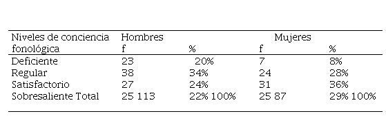 En la tabla 5 y figura 3 se observa que; la mayoría de los estudiantes varones son capaces de desenvolverse con éxito en las sub pruebas 1 y 3, pero con dificultades para operar con eslabones silábicos, así como para identificar palabras con premisas fonémicas determinadas.