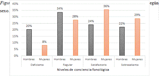 Asimismo, se encontró que existen diferencias significativas en las dimensiones de conciencia fonológica según sexo en estudiantes de educación inicial de instituciones públicas y privadas de la UGEL 06. Los resultados descriptivos dan cuenta que en el nivel sobresaliente se ubica, el mayor porcentaje de las estudiantes mujeres 36% y 29% en el nivel satisfactorio y sobresaliente. El 34% y 20%, de los estudiantes varones, se ubican en los niveles regular y deficiente respectivamente. Y en el resultado inferencial se tiene que según la prueba U Mann Whitney. (p = 0,000 < 0,05), lo cual indica que la conciencia fonológica, no es igual en los estudiantes según sexo.