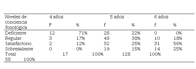Tabla 6. Distribución de frecuencias de los niveles de conciencia fonológica según edad