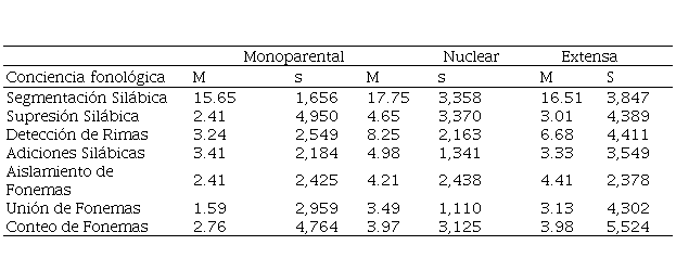 Esto se podría deber a la existencia de diferencias lingüísticas en el estilo de interacción familiar, pues Bernstein (1971), sugiere que el uso del lenguaje en casa y los contextos de aprendizaje social proporcionan al niño o la niña, un abanico de experiencias lingüísticas que permite el desarrollo de la conciencia fonológica. En el caso de las familias nucleares la interacción se da en un modo más estable y profundo, en relación con las familias monoparentales o extensas.