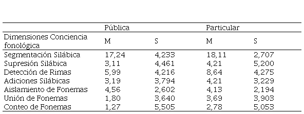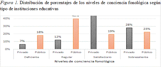 Estos resultados coinciden con los encontrados por Aravena (2013), quien constató que los escolares provenientes de colegios particulares subvencionados alcanzaron un desempeño más favorable de conciencia fonológica, a diferencia de los escolares de colegios municipalizados. Tales resultados se sustentan en los expresados por Panca y Dioses (2000), quienes también confirmaron que, los alumnos procedentes de colegios privados superaron a los colegios públicos, tanto en la lectura de letras, silabas y palabras como en la lectura de textos y comprensión. Así también con los resultados de Balarezo (2007), afirmando que los alumnos procedentes de colegios privados muestran un mejor desempeño de conciencia fonológica, a diferencia de los alumnos de colegios públicos.