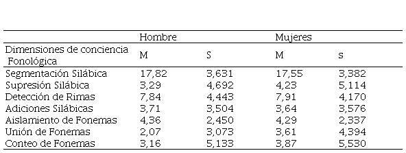 En la tabla 9 se aprecian los promedios de la evaluación realizada sobre las dimensiones de conciencia fonológica en los estudiantes, según género y los promedios más altos en: segmentación silábica (17,82), Adiciones Silábicas (3,71) y Aislamiento de Fonemas lo tienen los estudiantes del género masculino (4,36), mientras que en: supresión silábica (4,23), detección de rimas (7,91), Unión de Fonemas (3,61) y Conteo de Fonemas (3,87) el promedio más alto lo obtuvieron, las estudiantes mujeres.
