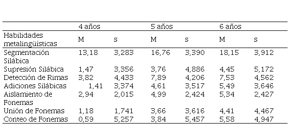 Finalmente, los resultados indican que existen diferencias significativas en las habilidades metalingüísticas a favor del grupo de 5 y 6 años de edad. Estos resultados concuerdan con los encontrados Coloma, Cobarrubias y De Barbieri (2007), cuyos resultados obtenidos indican que los preescolares de 5 años evidencian un rendimiento significativamente mayor al grupo de niños de 4 años en tareas de conciencia fonológica. Lo anterior, permite concluir que existe un incremento de las habilidades metalingüísticas relacionadas con la sílaba al comparar preescolares de 4 y 5 años.