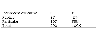 En la tabla 1 se observa, que del 100% de los estudiantes, el 46,5% (93) pertenecen a instituciones educativas públicas y el 53,5% (107) pertenecen a instituciones educativas particulares.