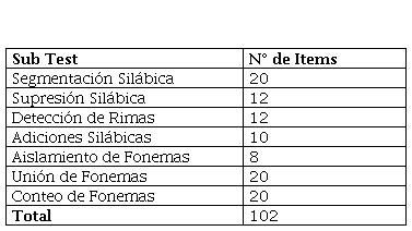 Este Test valora el grado de desarrollo de las habilidades metalingüísticas al iniciar el aprendizaje de la lectura. El presente estudio utilizó la adaptación hecha por Noemí Panca en el año 2000. La confiabilidad de esta adaptación se realizó mediante la técnica de dos mitades usando la fórmula de Kuder – Richardson 20 obteniéndose el puntaje de 0.81 y con la técnica de consistencia interna utilizando Alpha de Cronbach se obtuvo el puntaje de 0.81. Se realizó la validez de contenido mediante el criterio de jueces y la validez de construcción por el método de análisis factorial exploratorio siendo la variante explicada 47.69. Asimismo, la medida de adecuación de muestreo de Kayser – Myer – Olking es de 0.83.