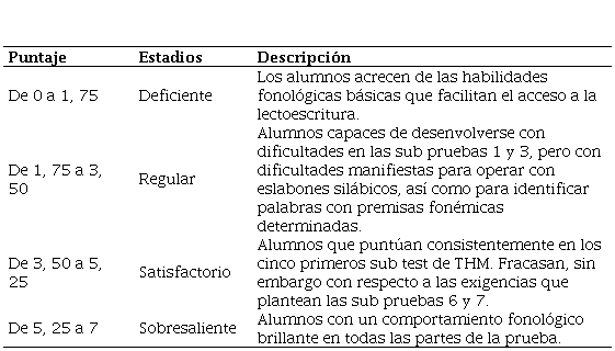 Las puntuaciones de todas las sub pruebas oscilan entre 0 y 1, siendo la máxima puntuación que puede obtener el examinado 7 y la mínima 0. Cada ítem correctamente resuelto por el niño (a) se valora como 1 punto. La puntuación de cada sub test se obtiene hallando el cociente entre el número de aciertos del examinado y el número total de ítems del sub test. La puntuación total de la prueba es la suma de todos los cocientes de los sub test. De acuerdo a los resultados totales obtenidos se agrupan en 4 categorías: