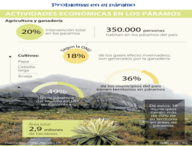 En Colombia, en abril del año 2015, se reportaron 364 títulos mineros en zonas de páramo, equivalentes a 79.930 hectáreas de páramo destinadas a la extracción de carbón, oro, zinc, entre otros, de los 364 títulos, la empresa Anglogold posee 40 de estos, correspondientes al 34 % del área minera en páramos, seguida de Eco Oro con 9 títulos y 12 % del área y Minas Paz del Río con 9 títulos y el 9 % del total de minería ubicada en páramos.