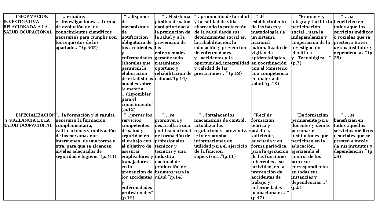 A continuación se presenta el análisis de los contenidos obtenidos por medio de la revisión realizada en distintas normativas sobre el tema estudiado para la teorización y generación de nuevos conocimientos, a través de la interpretación, partiendo de la categorización donde se describe el proceso y la producción de la investigación, agregándole el aporte, a través de los significados donde se contrastan y comparan con elementos teóricos que explican dicha realidad, a fin de llegar a nuevos conocimientos. Ver Cuadro Nº 1: Basamentos legales relacionados con la salud ocupacional del docente universitario.