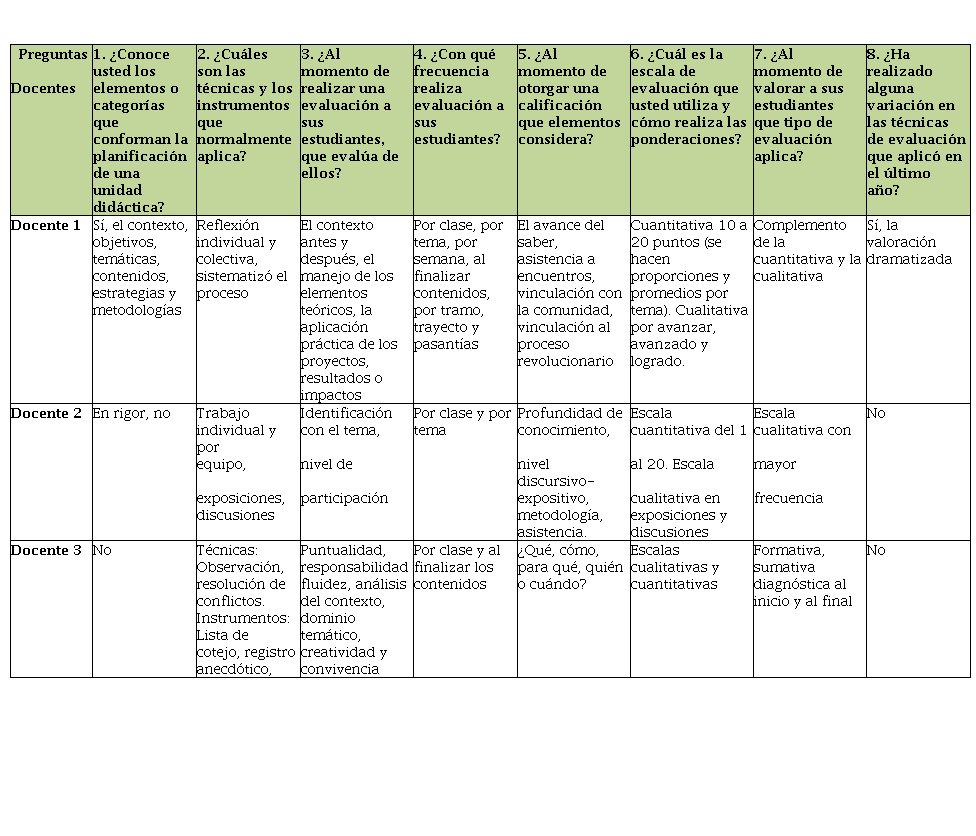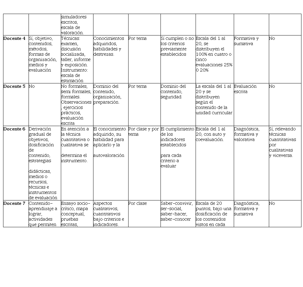 Las prácticas de la evaluación de los aprendizajes en el contexto de la unidad curricular Bases Ecológicas de Sistemas Ambientales ponen de manifiesto las preferencias en la evaluación sumativa respecto a la formativa, específicamente se enfocan en la medición de contenidos conceptuales y procedimentales y en muy pocos casos los actitudinales. Ello se explica en la formación que poseen los docentes, que está orientada a profesiones ajenas a la licenciatura en educación. De esta forma, se evidencia la persistencia hacia la medición como resultado en menoscabo de la evaluación procesual e integral. Asimismo, se constata que existen contradicciones en los docentes cuanto a qué evaluar, cuándo evaluar y con qué evaluar.