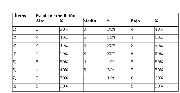 Con la aplicación de la técnica matriz de datos se procedió al procesamiento estadístico de los resultados. A partir de los datos tabulados en el cuadro N°2, los 10 docentes encuestados fueron distribuidos de acuerdo a la respuesta dada, la cual se presentó en frecuencia y porcentajes, con una escala de medición alto, medio y bajo respectivamente, en función del conocimiento que poseen los docentes sobre las interrogantes realizadas en la evaluación de los aprendizajes.