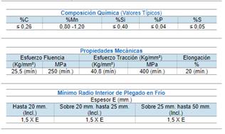 De los cuales se ha concluido que el acero estructural más adecuado para el implemento es el ASTM A36, que se lo puede encontrar en todo el país en forma de barras, planchas, tubos, cilindros macizos, etc. cuenta con las siguientes características: