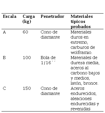 Ensayo de dureza Rockwell en materiales Duros. Se utiliza como penetrador un cono de diamante de 120° de ángulo de vértice redondeado en la punta. Se usan cargas normalizadas de 60, 100 y 150 kilogramos, con el subíndice indicado en la Tabla 1. El parámetro A de la Ecuación 9 es 100.