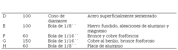 Ensayo de dureza Rockwell en materiales Blandos. Se utiliza como penetrador una bola de acero templado, similar al del ensayo Brinell. En la tabla 13 se observan diámetros y cargas normalizados para este tipo de ensayos. En este ensayo, el parámetro