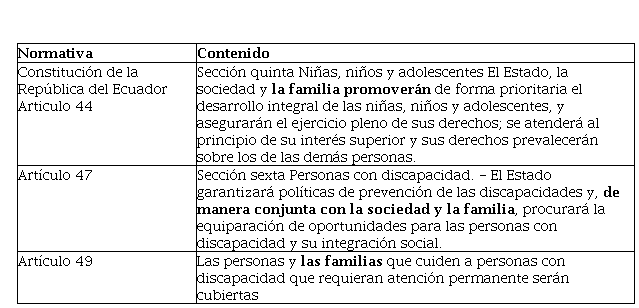 En la legislación ecuatoriana no existe un cuerpo independiente de normas que regulen todo lo referente a la familia, pero, partiendo desde la Constitución de la República del Ecuador (2008), sin dejar de considerar otras normas de carácter secundario, encontramos disposiciones que tratan de proteger a la familia como Institución, en el