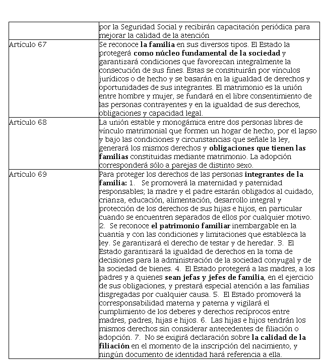 Artículo. 67.- Se reconoce a la familia en sus diversos tipos. El Estado la protegerá como núcleo fundamental de la sociedad y garantizará condiciones que favorezcan integralmente la consecución de sus fines. Estas se constituirán por vínculos jurídicos o de hecho y se basarán en la igualdad de derechos y oportunidad de sus integrantes. El matrimonio es la unión entre hombre y mujer, se fundará en el libre consentimiento de las personas contrayentes y en la igualdad de sus derechos, obligaciones y capacidad legal.