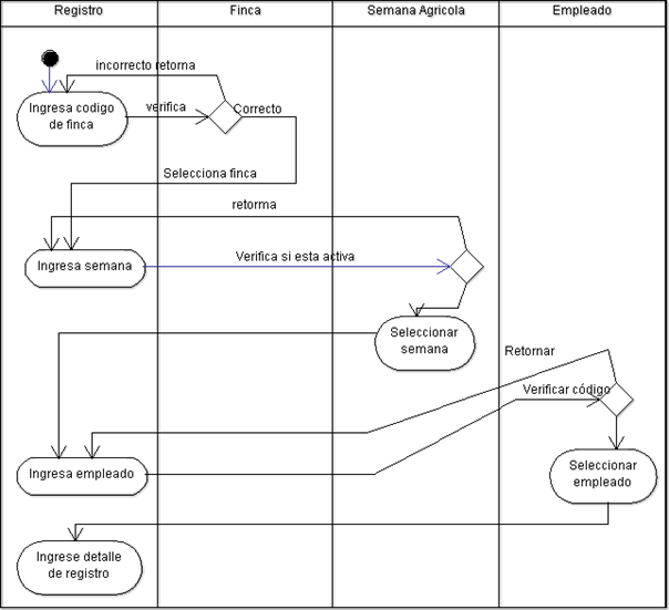 En este diagrama se registras los eventos del colaborador de la empresa agrícola, detallando el código de la finca, la semana y la gestión del empleado, el registro es diario y de esa manera se tiene un reporte de avance o de finalización de tareas.