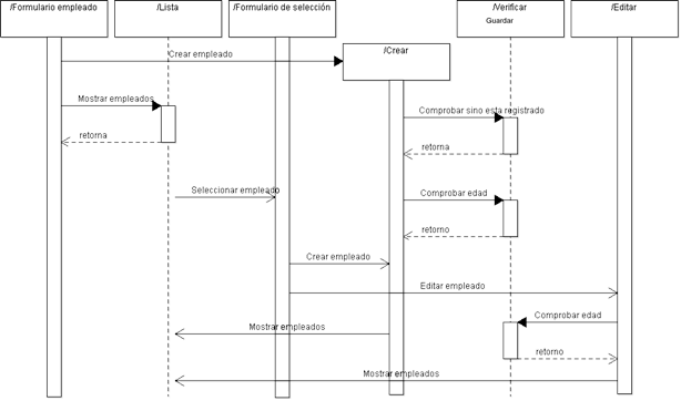 En este diagrama se ve la iteración del usuario con el sistema y los diferentes estados en el momento de creación de un empleado en el tiempo, se identifican de manera secuencial como debería ser el comportamiento de la aplicación