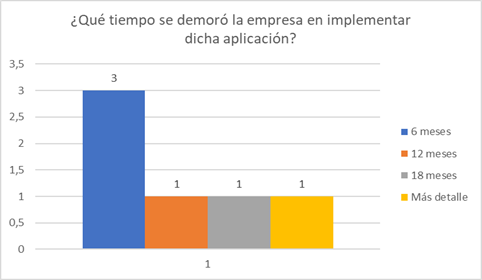En el gráfico 2, se puede identificar que le 50% de la empresas solo demoraron en implementar 6 meses y que el 16% por cada una de ellos fueron en diferentes tiempos , eso se debe que algunos desarrollaron un software a la medida, otros adquirieron software ya desarrollados y otros solo utilizan Excel , siendo el último el más rápido en el aplicación ya que vienen en todos los sistemas operativos Windows y la demora se basa en diseñar y calcular las fórmulas para el llenado de las plantillas, además que no necesitan personal especializado para diseñar el control.