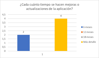 En el gráfico 4, el 33,33% realizan actualizaciones en sus aplicaciones cada 6 meses, esas actualizaciones muchas de las veces están a cargo, de la empresa que desarrollo el software o del departamento de telemática e la empresa agrícola. El 66.66% la realizan las actualizaciones según lo requieran y otros la realizan cada 2 años, cuando existen cambios sustanciales dentro de la empresa.