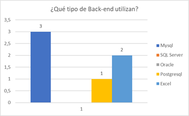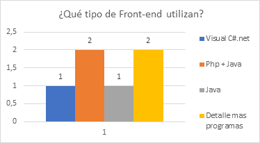 En el gráfico 5, el 33.3% (Php+Java) define que se utilizó estas dos aplicaciones para desarrollar el frond-end en sus aplicaciones, lo que nos indica que estas aplicaciones son sitios web, con la gran ventaja que es multiplataforma. El 16.66% a utilizado Visual C#. net como desarrollador aplicaciones de escritorio, de igual manera el 16.66% utilizo Java para el desarrollo y el otro 33.3% utiliza Excel como aplicación de control de la nómina y pago de la misma.