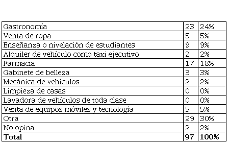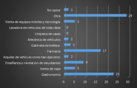 En la opinión de los encuestados la mayor parte tienen diferentes habilidades que les gustaría explotar pues son propias de ellos o quizá sea herencia de familia por eso representan un 30% y es de mayor porcentaje con respecto a las demás, le sigue la gastronomía con un 24% a esto se debe el incremento de restaurantes y locales de comida rápida, a continuación con un 18% se encuentra farmacia pues se ha visto que tanto universidades como otras instituciones han otorgado cursos como asistentes de farmacia lo que es muy seguido por muchas personas, le sigue enseñanza y nivelación a estudiantes y profesionales con un 9%, luego se encuentra venta de ropa y venta de equipos móviles y tecnología con un 5% cada, seguido de vehículos y mecánica de vehículos con un 2% cada una, un 2% no opina y limpieza de casas y lavadora de vehículos ambas con un 0%.
