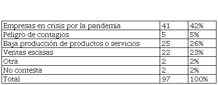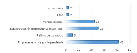 Según los encuestados piensan que la principal causa para que existan despidos es que las empresas entraron en crisis que por la pandemia 42%, mientras que 26% indican que ha existido una baja producción de los productos o servicios que las empresas generan, así como un 23% en cambio manifiestan que las ventas de los productos o servicios que ofrecen son escasas, en cambio un 5% afirman que hay un peligro de contagios entre el personal que labora en las empresas, un 2% dicen que existen otras situaciones más, y un 2% no responde esta pregunta.