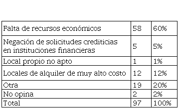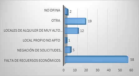 Los encuestados han tenido alguna idea de negocio o emprendimiento, pero situaciones ajenas a su voluntad no les permite que sean cristalizados, como la falta de recursos económicos con un 60%, le sigue la negación crediticia 5%, local propio no apto el 1%, locales de alquiler a precios muy altos 12%, otra situaciones 20% y un 2% no opina