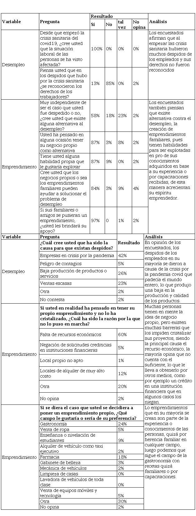 Haciendo una síntesis podemos decir que la investigación se ha centrado en obtener los resultados sobre cómo ha afectado la crisis sanitaria al campo laboral, encontrándose un problema muy grave como es el desempleo y que se ha puesto de manifiesto ante esta situación para hacerle frente. Las medidas que muchas personas han tomado ha sido la creación de un emprendimiento familiar, basado en la experiencia, la adaptación, el rol y personalidad ante todo.