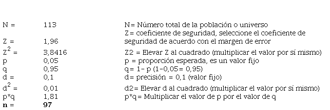 Se generó un procedimiento metodológico fundamentado desde un tipo de investigación descriptiva con diseño no experimental. Se tomó en cuenta la población de emprendedores de la ciudad de La Troncal – Cañar, siendo este de 113, aplicándose la siguiente formula para establecer el número de la muestra: