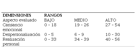 Categorizándose las subescalas, del siguiente modo: niveles bajos, medios o altos, de cansancio emocional (<17; 18-26; >27), despersonalización (<8; 9-12; >13), realización personal (<16; 17-22; >23) y Burnout (<38; 39-51; >52), desplegándose en el cuadro 1.