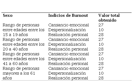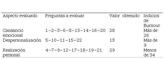 La muestra encuestada, al alcanzar un valor de 28 en cansancio emocional, se indica que se encuentra en un factor alto. En el orden de despersonalización, se alcanzó una puntuación de 13, calificándose como alta despersonalización. En cuanto a la realización personal, al obtener un valor de 29, se ubica en un rango bajo, tal como si indica en el cuadro 2, denotándose presencia de Síndrome de Burnout.