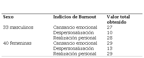 Otros resultados a tener en consideración, se circunscriben al porcentaje de indicios de Burnout, por diferenciación de sexo, para lo cual, se tiene una muestra discriminada en 40 femeninas y 33 masculinos, evidenciándose en el cuadro 3.