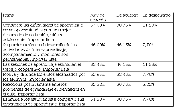 Además, se diferenció que se concibe estimular y motivar el trabajo y los logros alcanzados por los estudiantes a fin de dar seguimiento y apoyo al progreso de los estudiantes. Al respecto, resulta sorprendente la reacción positiva ante la problemática dada en la sala de clases donde los agentes educativos accionan a fin de superar la dificultad detectada. Así se estimula a compartir sus experiencias de aprendizaje que favorece a la presencia, participación y logro de cada uno de los estudiantes. Esto revela que en un alto grado se da importancia a la educación inclusiva.