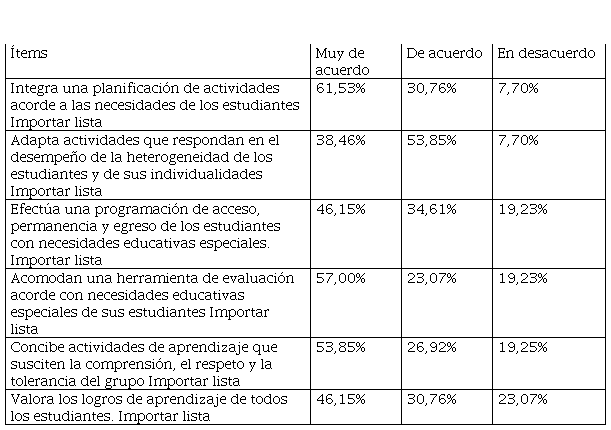 El docente en su accionar efectúa una planificación de acceso, permanencia y egreso de los estudiantes con necesidades educativas especiales, es decir que el 46,15% de la población encuestada ejecuta una programación estratégica que determina el trabajo del colectivo pedagógico, que concibe la necesidad de un tratamiento diferenciado de los estudiantes a fin de mejorar el desempeño durante su edad escolar. Esto seguido del 34,61% de profesores que ven la necesidad de comprender las diferentes formas de promover el aprendizaje, creando igualdad de condiciones y oportunidades a fin de que los actores del hecho educativo tengan la disposición para sumir el reto de educarse y progresar. Atrayente es el porcentaje en desacuerdo marcado en un 19,23% que implica cómo la resistencia a la transformación educativa no da espacio a que los estudiantes tengan correspondencia de condiciones para el aprendizaje, bajo el principio de integración escolar y social que supone una escuela integradora.