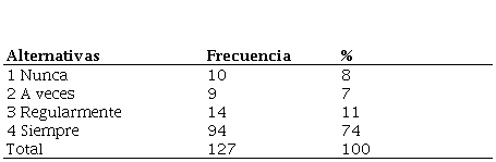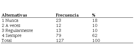 La opción siempre respondió en un 76% que se motiva a estudiar a partir del uso de juegos dirigidos en clases, mientras que la opción regularmente se refirió en un 7% a veces 8% y nunca 9%