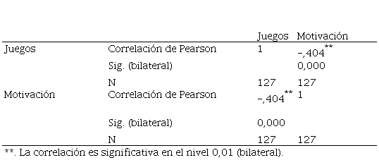 Al generarse un resultado de -, 404**se obtiene una correlación de Pearson negativa débil, estableciéndose una relación inversamente proporcional, por lo que implica que la motivación se ve influenciada positivamente por los juegos dirigidos, así mismo al producirse correlación significativa en el nivel 0,01 se acepta la hipótesis afirmativa y se rechaza la nula.