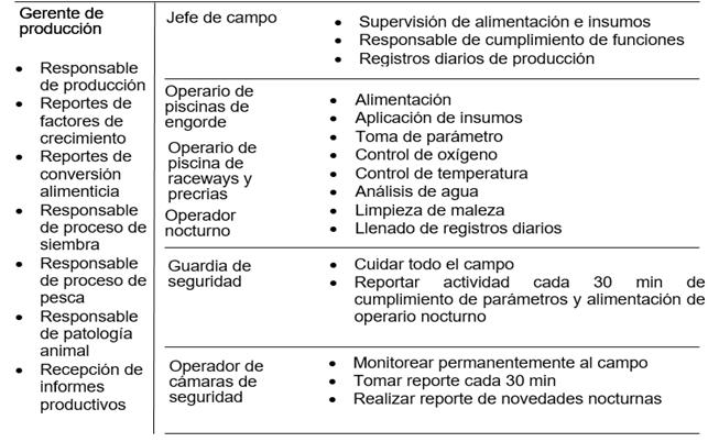 Operaciones: En la figura 10, se muestra el manual de funciones resumido con las actividades más importantes del personal que labora en campo.
