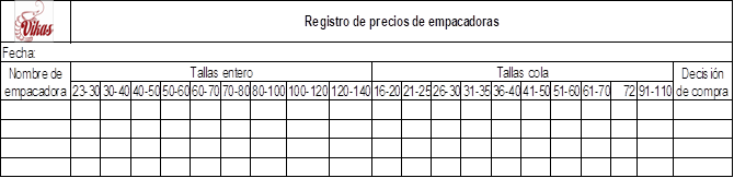 Fuente: Investigadores, 2020.Ventas: n la figura 8 se observa un planteamiento de diseño de tabla para los análisis de precios por de la empacadora, en la que detalla las tallas en entero y cola con el fin de tomar la mejor decision de venta.