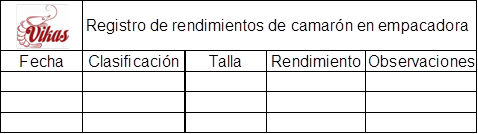Post ventas: En la figura 12 presenta un modelo de registro de rendimiento camarón enviado de la empacadora, para llevar un control del producto y posteriormente receptar liquidación de venta.