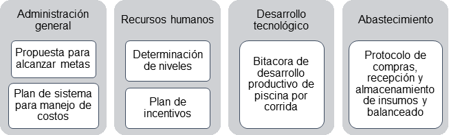 En el área productiva la compañía mantiene una correcta fluidez de información, lo que es muy importante para optimizar operaciones, sin embargo, no mantienen formatos completos para un correcto flujo de información y datos estadísticos productivos. En la proveeduría se mantienen tiempos de pedidos, stock mínimos y máximos, kardex de bodegas, pero existe una falencia que no se evalúan posibilidades de buscar proveedores alternativos a los actuales, lo que puede tener una consecuencia en los costos productivos.