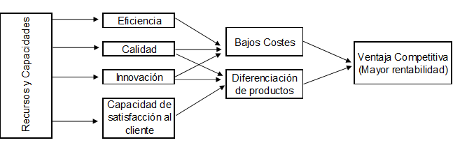 Prosiguiendo con lo expuesto, ( Maroto, 2017), expresa que los factores internos son los mas importantes para generar y mantenerla competitividad dentro en una organización, siendo los recursos y las capacidades el origen para llevar a la eficiencia, además de mejorar la calidad que se refiere a la diferenciación y costo que da igual a una mayor productividad, a la innovacion que son los procesos en los que intervienen los costos, o producto que lo logra la diferenciación, o por ultimo la satisfacción del cliente en cual se liga a al diferenciación.