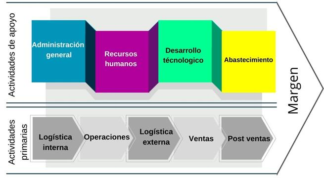 Dada la importancia de la cadena de valor, se divide el análisis de la cadena de valor en cinco actividades principales. Luego, los divide en cuatro actividades que ayudan a apoyar las actividades primarias. Los eslabones de la cadena de valor se dividen en actividades primarias y secundarias. De las cuales las más importantes son: logística interna y externa, las operaciones de la empresa, marketing, y servicio. La idea de los cinco conjuntos de actividades es crear un valor que exceda el costo de llevar a cabo esa actividad, generando así una mayor ganancia. Según ( Porter, 1985) las actividades principales son: