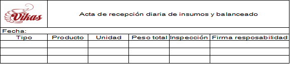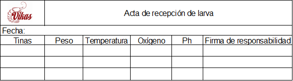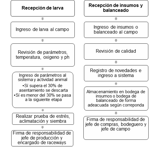 Logística de entrada: En la figura 5, se plantea un modelo de proceso de recepción de larva, insumos y balanceados, que son escenciales para la producción del camarón y en las figura 6, 7, se propone el formato de actas de recepción.