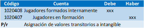 Para este proceso, se recomienda una combinación entre los siguientes métodos, costo por criterio de éxito y costo por grupos / camadas por ser los más adecuados para el medio deportivo nacional. Dentro de este marco, la metodología propuesta recomienda asignar los costos de formación de todo el conjunto de jugadores amateur a los jugadores que efectivamente logren firmar un contrato de fútbol profesional con el club deportivo, teniendo en cuenta que el periodo de formación de los jugadores oscila entre los 3 y 5 años, para lo cual será necesario crear una cuenta transitoria dentro del activo para acumular todos estos valores. Cuando un jugador forme parte de la plantilla profesional, este valor correspondería al valor inicial del activo intangible.