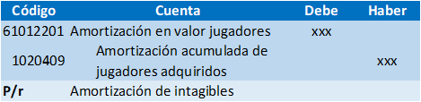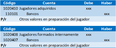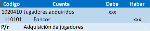Para los jugadores adquiridos, la metodología propuesta establece que se asignen al activo intangible los valores de adquisición y cualquier otro valor en que se incurra para poner en total forma y disponibilidad a los jugadores para ser parte de la plantilla que va a representar al equipo en campeonatos tanto nacionales como internacionales. Para este caso los valores incurridos en la adquisición y preparación del jugador se deberán aplicar directamente a la cuenta del intangible.