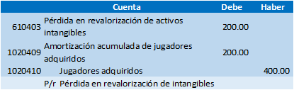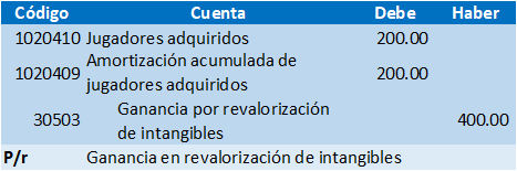 Para los jugadores adquiridos, el valor convenido en el contrato deberá ajustarse al valor razonable del mercado para evitar revalorizaciones a corto plazo. Dentro de este proceso deberá tomar en cuenta las respectivas amortizaciones acumuladas a la fecha del revalúo; estos ajustes deben ser consideradas de acuerdo a cada caso, en primer lugar, si la revalorización genera un superávit en el valor del jugador será clasificado y registrado como otros resultados integrales en la cuenta ganancia en revalorización de activos intangibles; por otra parte, si esta revaluación ocasiona una pérdida de valor del activo, será registrada en el resultado del periodo como pérdida en revalorización de activos intangibles.