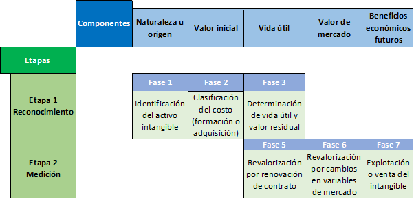 En la figura 2 se aprecian los componentes y las características de los activos intangibles que se han venido estudiando, todos estos son elementos derivados de la investigación y constituyen la base para el desarrollo de esta propuesta. Cada uno de los componentes deberá determinarse de acuerdo a lo que indica la figura 3, en la cual se detallan las diferentes fases comprendidas en las etapas de reconocimiento y medición de este grupo de activos.