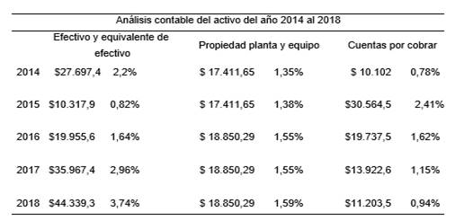 La cuenta de efectivo y equivalentes al efectivo, comprende el efectivo de caja y las cuentas corrientes de la empresa en instituciones financieras, con libre disponibilidad. La entidad registra el valor de sus partidas al costo histórico, como se observa en la tabla 13 del año 2014 al año 2018 ha tenido una variación significativa pasando del 2,15% al 3,74% lo que significa que la empresa cuenta con disponibilidad de efectivo para hacer frente a las necesidades presentes por el giro del negocio. Con respecto a la cuenta propiedad planta y equipo la empresa al adoptar las NIIF muestra los saldos de la cuenta al costo de adquisición menos la depreciación acumulada, utilizando el valor razonable para ajustar las partidas, este procedimiento es permitido por la normativa, es así que, se observó una modificación que disminuyó el valor de esta partida en el período de adopción.