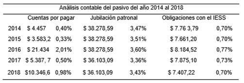 Durante el período 2012 no se actualizó dicho cálculo ni la provisión. Para los períodos 2014 ? 2015 el valor por jubilación patronal fue de $ 38.278,59 disminuyendo en 6% para el año 2016 manteniéndose constante hasta el año 2018 con un valor de $36.103,09 dólares. Analizando las obligaciones con el IESS se observa que durante el período 2014 fue de $ 7.763,79 representando el 0,70% del total de activos incrementándose en el año 2015 en 6,83%, para finales del año 2018 ésta cuenta disminuyó en 5,94% debido a la reducción de personal pues los gastos por concepto de sueldos y salarios también disminuyeron.